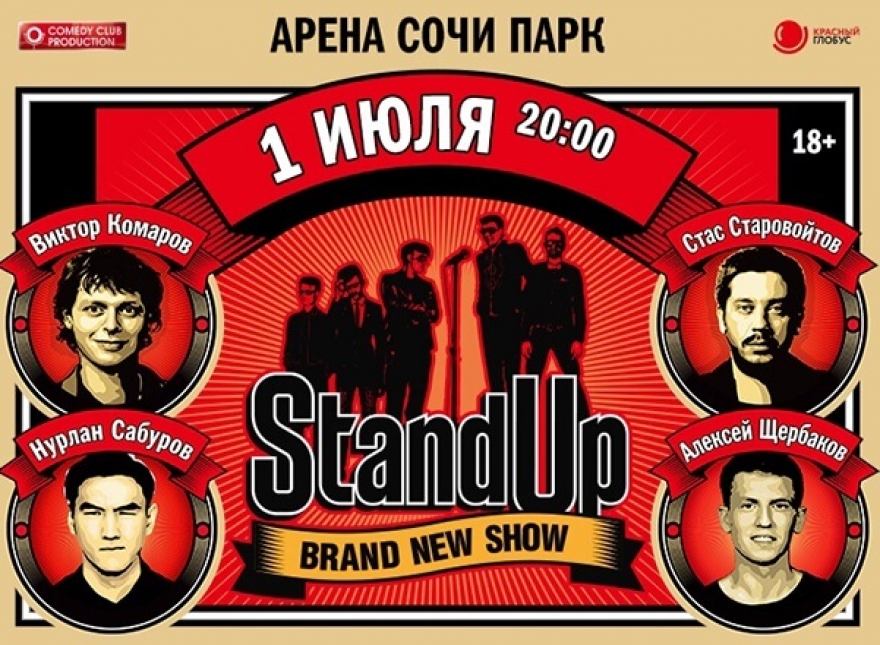 Откроют серию постоянные резиденты шоу StandUp телеканала ТНТ Стас Старовойтов, Виктор Комаров, Нурлан Сабуров и Алексей Щербаков. Организаторы обещают, что концерт, который пройдет на Сочи Парк Арене в первый день июля, станет уникальным коктейлем из самых разнообразных монологов и шуток.