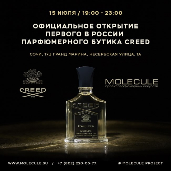 Каждый из брендов-участников проекта парфюмерных искусств MOLECULE – уникален и неподражаем и одним из них стал Королевский Парфюмерный Дом CREED. Династия парфюмеров была основана в 1760 году, Джеймсом Генри Кридом, когда в Лондоне он открыл свой первый магазин. В XIX веке парфюмерный дом становится известным по всей Европе и поставляет духи ко всем королевским и императорским дворам. Сегодня полную коллекцию ароматов CREED можно найти лишь в эксклюзивных бутиках, в том числе в первом и пока единственном бутике Creed в Сочи!