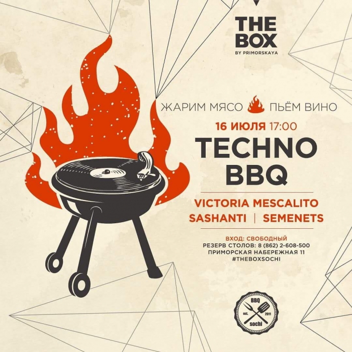 TECHNO: Атмосферную часть вечеринки возьмут на себя редкие гости города - Victoria Mescalito и Sashanti. Эта семейная пара диджеев и промоутеров хорошо известна за пределами России, география их выступлений простирается от Шри-Ланки до Ибицы, они знают про техно всё и не понаслышке. Компанию им составит Andrey Semenets, чьё имя уже давно ассоциируется с правильной музыкой в Сочи. В августе на венгерском лейбле Egothermia выходит пластинка Jupiter Summer - результат совместной работы Андрея и Sashanti, её неформальная презентация состоится в рамках вечеринки TECHNO BBQ.