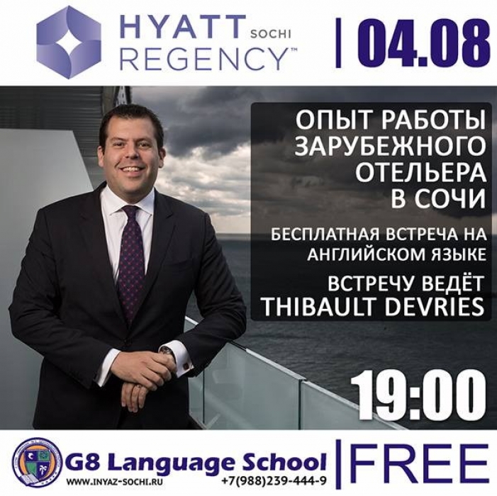 Отель Hyatt Regency Sochi и Языковой центр G8 приглашают вас на встречу «Опыт работы зарубежного отельера в Сочи» на английском языке. Встречу ведёт Thibault DeVries, генеральный управляющий Hyatt Regency Sochi.