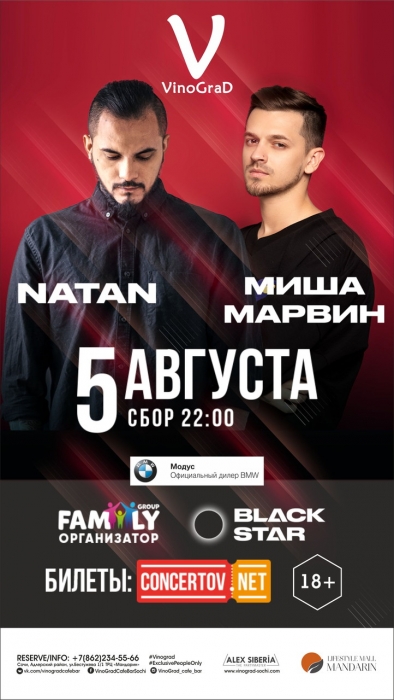 На площадке Vinograd Pool выступят 2 артиста самого мощного лейбла страны BLACK STAR INC. - NATAN и МИША МАРВИН!