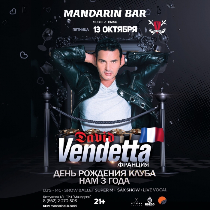 Мы э приготовили для вас много сюрпризов и подарков, и самый главный подарок - это наш специальный гость, DJ DAVID VENDETTA (ФРАНЦИЯ). Запомни дату - пятница 13 октября, будь в "Мандарине"!!! Отпразднуем вместе! Вся наша супер-веселая DREAM TEAM и ты - наш любимый гость, друг, брат, сестра... Всем быть!