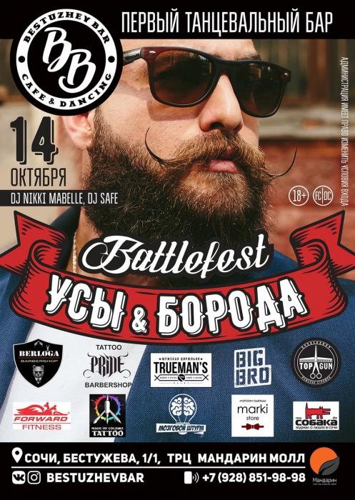 Наш фестиваль это крутое бородатое действо, где мы вместе с профессиональным жюри выявляем самого самого бородатого, стиляжного, харизмотично-усатого бородача и дарим ему 10000. Также в битве участвуют не только ребята- конкурсанты, но и гости, которым мы безжалостно сбриваем лишнее или делаем аккуратные бородо-стрижки, пьем много-много любимых напитков, едим вкусные бургеры и танцуем, пока ноги могут.