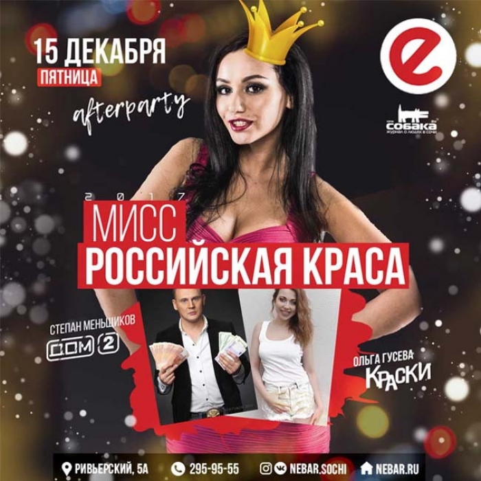 After party конкурса «Мисс Российская Краса 2017» - 15 участниц в сопровождение звездного ведущего Сепана Меньщикова, выступление группы «Краски», танцы до самого утра.