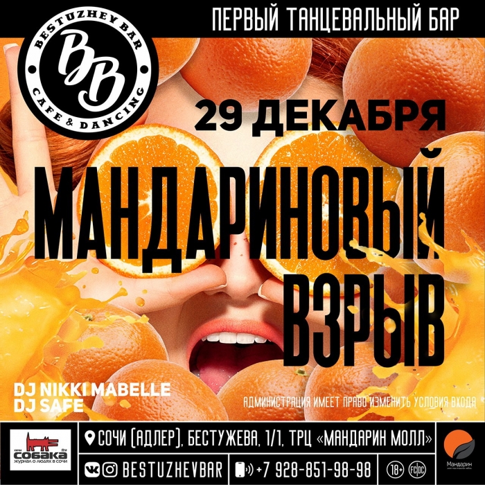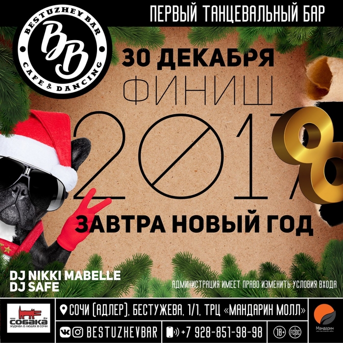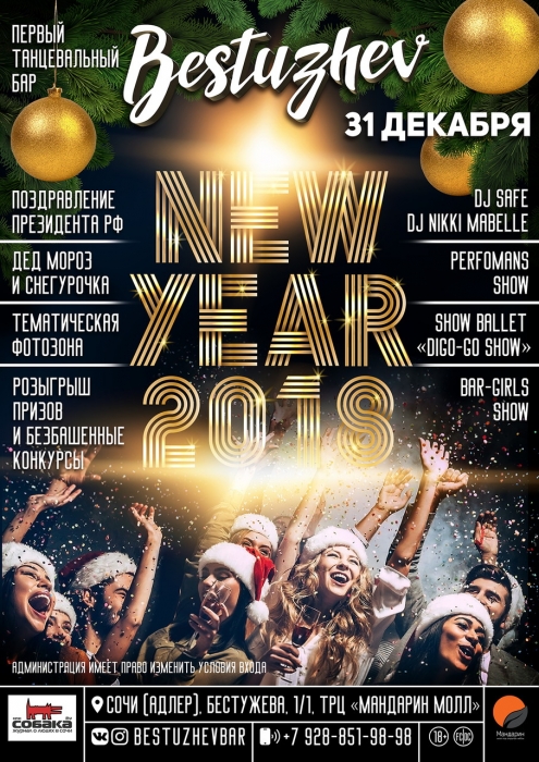 Приглашаем вас отметить его с нами,нас ждет эпическая ночь. Помножьте на три любую шумную пати BESTUZHEVBAR - так, и даже громче, мы собираемся встретить 2018, в эпицентре ночной жизни , под аккомпанементы лучших DJs ! С тематической фотозоной, с Дедом Морозом и Снегурочкой, с розыгрышами призов и безбашеными конкурсами, Show Ballet "DIAMOND" , Go-Go show, Bar-girls show, Perfomans show, DJ NIKKI MABELLE. DJ SAFE .