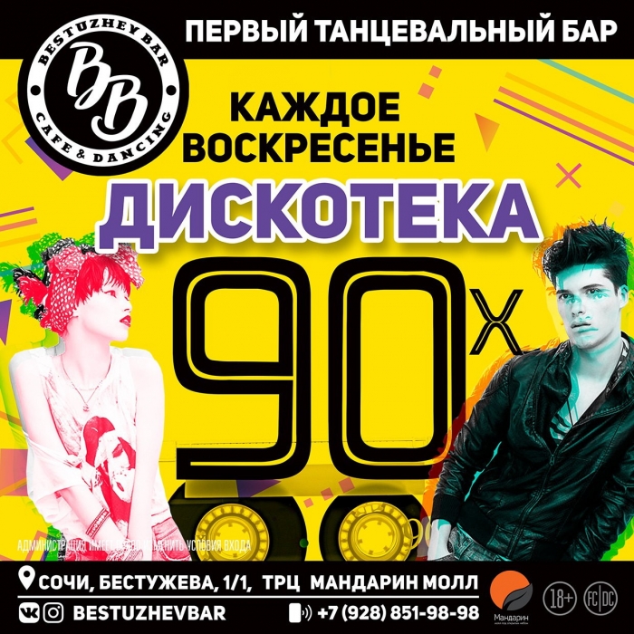 Школьная любовь и первые свидания. Волей-неволей хочется вернуться в то время, пропитанное вкусом жвачки «Love is…», Доктора Пеппера, тетрисом и тамагочами вместо айфона, журналами «Cool», «Bravo» и «Все звезды» вместо новостной ленты Инсты. Дискотека 90-х дает такую возможность: вместе вспомнить беззаботное время под хорошо знакомые хиты далекого прошлого: «Солнышко в руках», «Попрошу тебя», «Freestyler» и многие другие. Ждём всех, кто сну предпочитает танцы!