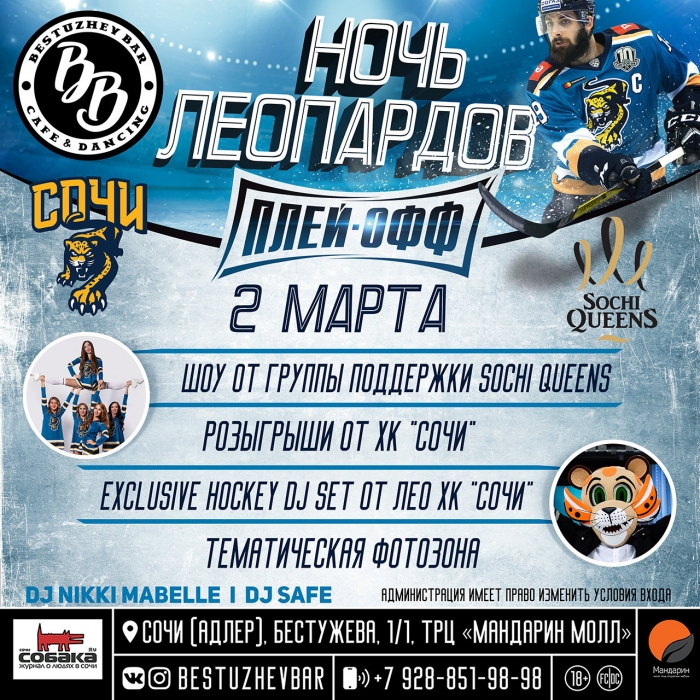 ЙУУУУУХХХХ!!! Мы в плей-офф. Да, да - мы, все с Вами, с Любимой командой, начинаем яростно болеть и здорово играть! Мы за бурю эмоций, азарт, драйв и дух соперничества. Команда услышит, увидит нашу поддержу - это мы гарантируем. А так же точно будет: Крутое Шоу от группы поддержки Sochi Queens ; Розыгрыши и викторины с классными подарками от ХК "Сочи" ; Тематическая фотозона ; Ну и на сладкое - Exclusive hockey Dj set от всеми любимого талисмана Лео ХК "Сочи" . Вообщем, такое пропускать не советуем. Лучшее Go-Go show, Bar-girls show, Perfomans show и эта затягивающая магнитом атмосфера. Буллиты и опасные "шоты" у барной стойки и лучшая музыка на свете. Горячая Хоккейная вечеринка в преддверии Плей-офф "Кубка Гагарина"