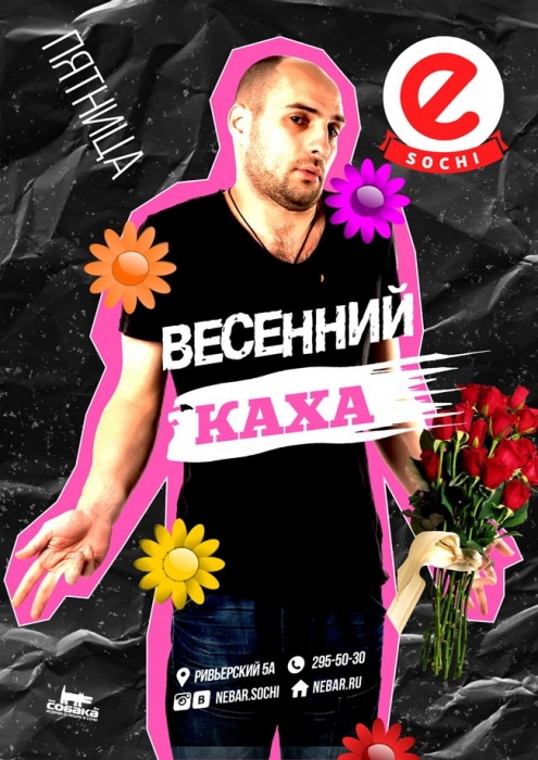 С наступлением весны Каха оттаял и готов дарить всем девушкам шампанское и свою любовь! Как известно, на его вечеринках скучно не бывает, алкоголь льется рекой, грязь на барной стойке особенно грязная и тайная комната особенно популярна. Разыгрываем эксклюзивные призы от Кахи и танцуем до утра.