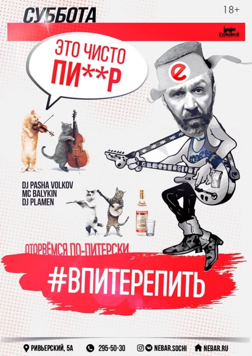Не останавливаемся! Продолжаем #ВПИТЕРЕПИТЬ! Заключительная из серии вечеринок, которые гремели на весть город, пройдет особенно жарко! Хэдлайнер ночи - DMC Морфей. Неповторимая атмосфера питерской тусовки, горячие бармены, грязые танцы на барной стойке и самые сексуальные девушки будут здесь!
