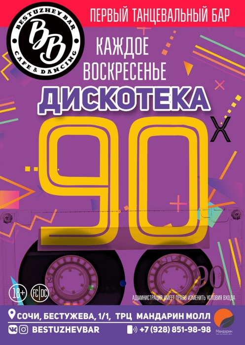 Школьная любовь и первые свидания. Волей-неволей хочется вернуться в то время, пропитанное вкусом жвачки «Love is…», Доктора Пеппера, тетрисом и тамагочами вместо айфона, журналами «Cool», «Bravo» и «Все звезды» вместо новостной ленты Инсты. Дискотека 90-х дает такую возможность: вместе вспомнить беззаботное время под хорошо знакомые хиты далекого прошлого: «Солнышко в руках», «Попрошу тебя», «Freestyler» и многие другие. Ждём всех, кто сну предпочитает танцы!