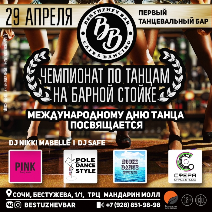 Готовьте наряды, танцы откладывать нельзя!ВЫ можете смотреть и участвовать! Чемпионат по танцам на барной стойке. Настало время безудержных танцев! Держите крепче свои напитки, и себя держите в руках, потому что участники самого заводного и безбашеного, который только можно вообразить, чемпионата по танцам, танцам на барной стойке, покорят вас. Ты клевый танцор? Тебе есть что показать зрителям? Любишь танцевать дома перед зеркалом? На танцполе тебе нет равных? Пришло время выходить на новый уровень! Bestuzhev bar приглашает тебя принять участие в ЧЕМПИОНАТЕ ПО ТАНЦАМ НА БАРНОЙ СТОЙКЕ! Победи и получи клевые призы!!!