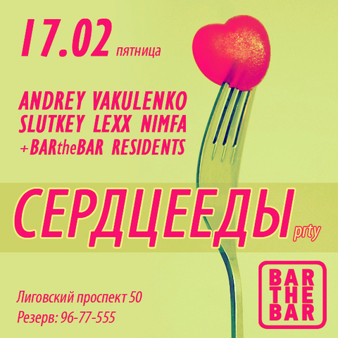 В честь дня всех влюблённых 17 февраля BAR THE BAR устраивает вечеринку: под танцевальные ремиксы Andrey Vakulenko, Slutkey, Lexx и Nimfa бар приглашает в любовное приключение всех самых обаятельных сердцеедов и сердцеедок города. Подогревать гостей будет специальный коктейль для влюблённых – «Сид и Ненси».
