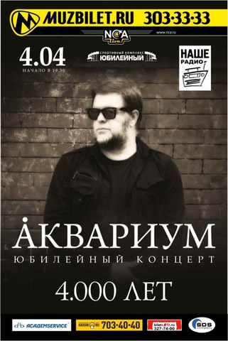 В 2012 году группе «Аквариум» исполняется 40 лет. В честь этого 4 апреля Борис Гребенщиков со товарищи даст большой концерт в ДС «Юбилейный» — с поздравлениями, сюрпризами и множеством песен — от новейших до тех, с которых когда-то все начиналось.