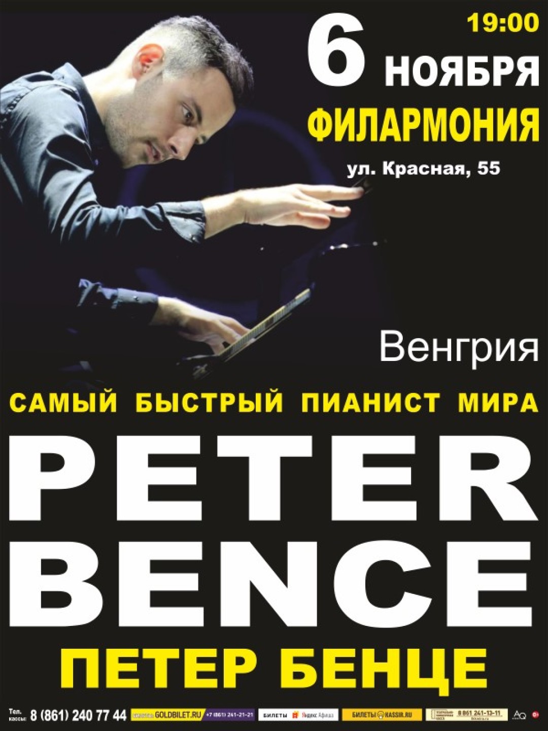 Петер Бенце – музыкант, чье исполнение мировых хитов не оставляет равнодушным даже самого взыскательного зрителя. Ввиду своих способностей исполнителя и композитора, Бенце был зачислен на курс по классу фортепиано и написания музыки в Berklee College of Music, где преподают самые влиятельные продюсеры музыкальной индустрии Америки. В 2012 году пианист был занесен в Книгу Рекордов Гиннеса как рекордсмен по скорости повторяемого нажатия одной клавиши в минуту (765 нот – прим. редакции), а позже стал писать музыку для телевидения, кино и театра.