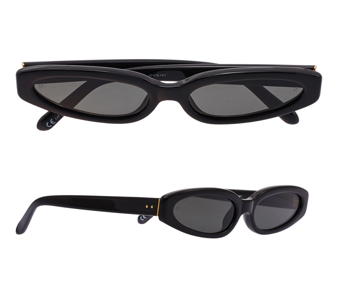 - Модные овальные очки в черной оправе Linda Farrow стоят 10 980 тыс.руб. со скидкой.