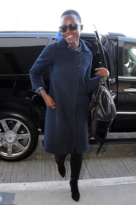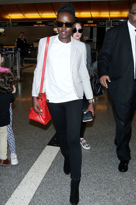 Мы так привыкли к showstopper-платьям Люпиты, что кажется, будто она не снимает их даже когда идет в магазин. В повседневности актриса выглядит, конечно, проще, но тоже с эффектом showstopper — строгие брюки, пальто или жакет, вместительная сумка яркого цвета и всегда темные очки.