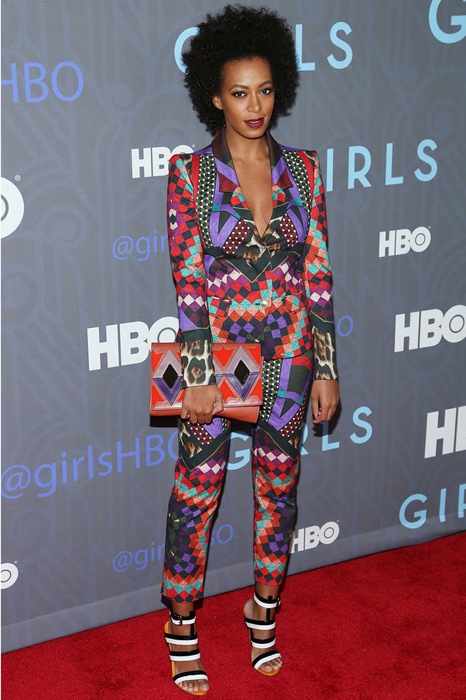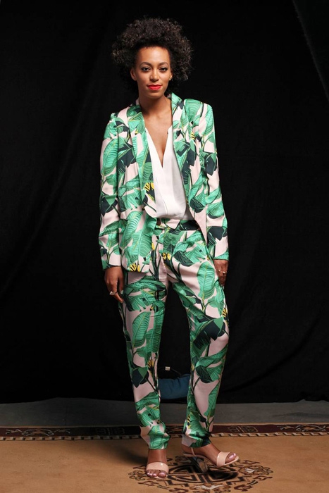 It-girls из стрит-стайл блогов привыкли показывать свою подкованность в трендах, миксуя несколько принтов в одном луке. Соланж делает все наоборот и считает, что костюм должен быть цельным: можно нарядиться с головы до ног в заросли лиан или небесный свод. Согласитесь, так гораздо проще — не нужно задумываться о том, как друг с другом будут смотреться полоска и, например, горох. Любимые костюмы певицы чаще всего состоят из шелковых штанов, напоминающих пижамные, и просторной рубашки. Вкупе с ними идут туфли-«лодочки» или босоножки с минимумом декора.