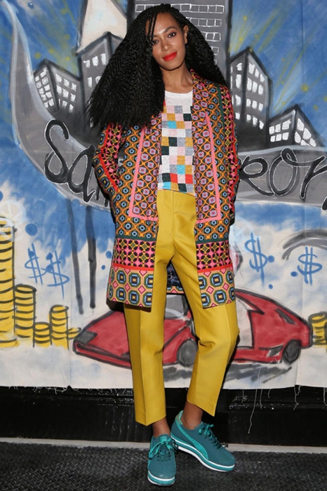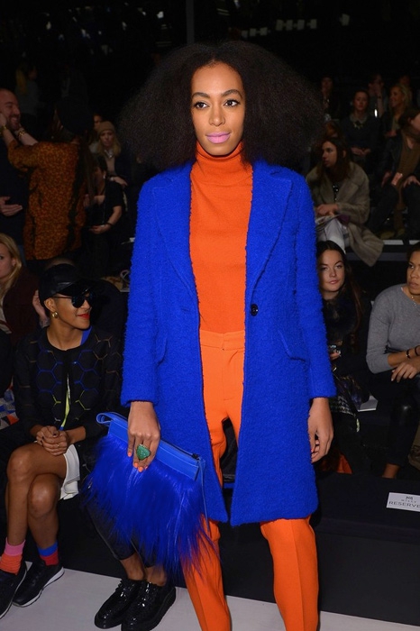 Вторая область стилевых экспериментов Соланж — это цвет. Здесь ее фантазия не знает предела: певица может надеть оранжевый костюм, пальто глубокого синего цвета и фуксиевые лодочки. Если на других, возможно, такое сочетание покажется нелепым, то на Соланж с ее «афро» и солнечными очками на пол-лица такой колористический набор смотрится ироничным и остроумным.