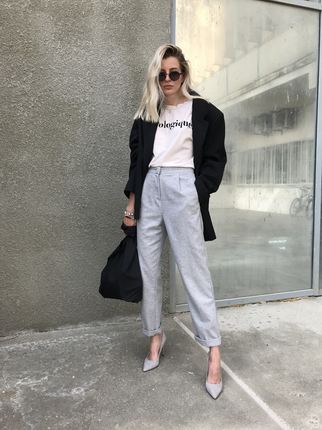 Идеальный серый камуфляж к стройкам — вот как бы я охарактеризовала свой стиль. (Смеется.) А серьезно — он отражение моей уверенности и вдохновения в сегодняшнем дне. Десять лет назад я боготворила Мартина Маржелу, сейчас боготворю еще больше, потому что он вовремя ушел. Бренд все равно остался любим, но только обувью и только таби. Из остальных это Ann Demeulemeester, Dries Van Noten, A. F. Vandevorst, Uma Wang, Yohji Yamamoto, COS и секонд-хенд. Однажды в Токио я купила двенадцать кимоно для себя, а в парижском секонд-хенде — мастерку Umbra для хорошего человека. То, что я обожаю больше всего, — это коллекция сумок Celine от Фиби Файло, хочется поставить их под стекло и в старости передать внукам как произведение искусства. Лучших сумок для меня сейчас в моде нет, а еще я очень берегу рюкзак Marsell. Когда я училась в институте культуры, у меня ежедневно случались фэшн-катастрофы, студенты будто тренировались между собой, кто ярче и фриковее выглядит. Но нас всегда побеждали юристы в общем корпусе, которые выделялись на нашем фоне черной водолазкой, джинсами и ботфортами сверху. Хуже лука для меня до сих пор не существует.