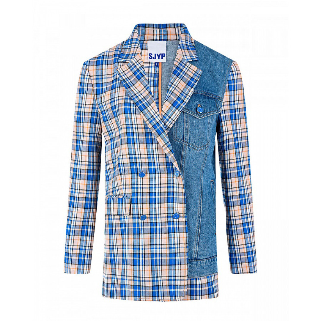 Добавляем яркости будням и аутфитам комбинированным жакетом от корейского бренда женской одежды SJYP, который создали супруги Стив Жанг и Йони Паи. И носим, как хочется, как минимум потому, что в одной вещи дизайнеры умудрились совместить сразу две — джинсовку и жакет в клетку.