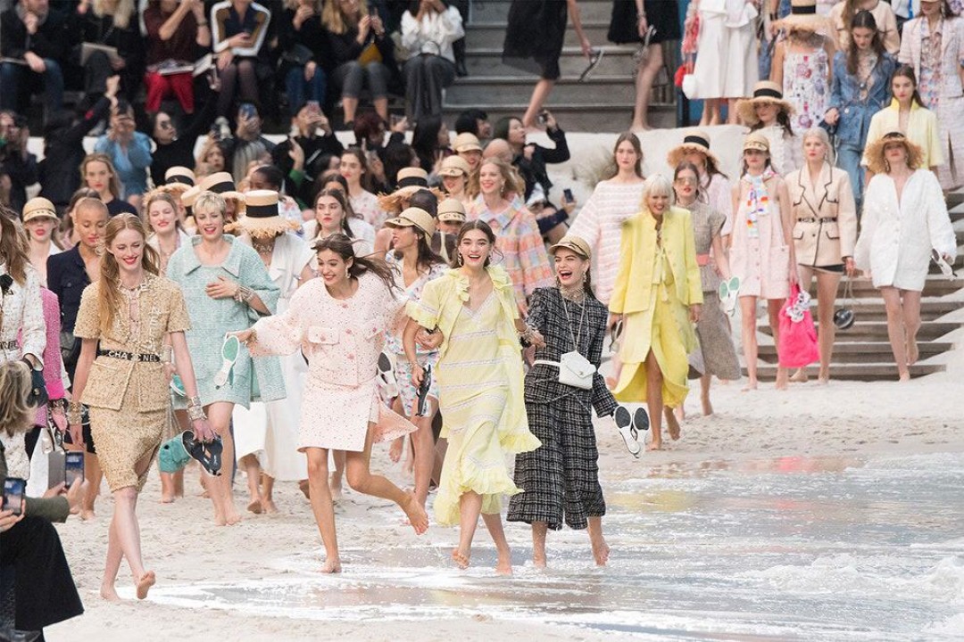 Chanel весна-лето 2019. Вместо подиума — пляж, а вместо классического финального выхода — шумная вечеринка на импровизированном побережье.
