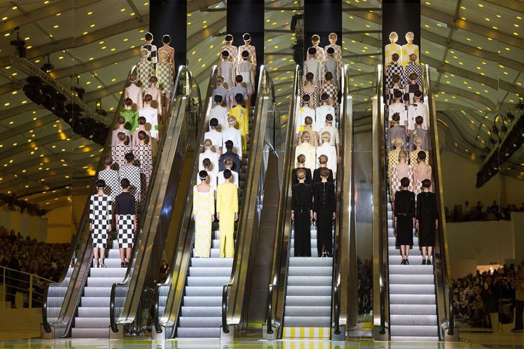 Louis Vuitton весна-лето 2013. В завершении шоу модели поднимались на четырех эскалаторах — этот показ Марка Джейкобса, который на тот момент был креативным директором бренда, запомнился всем.