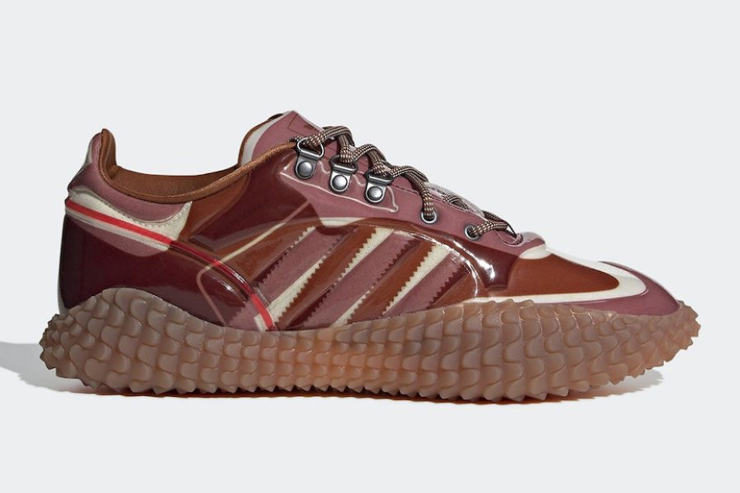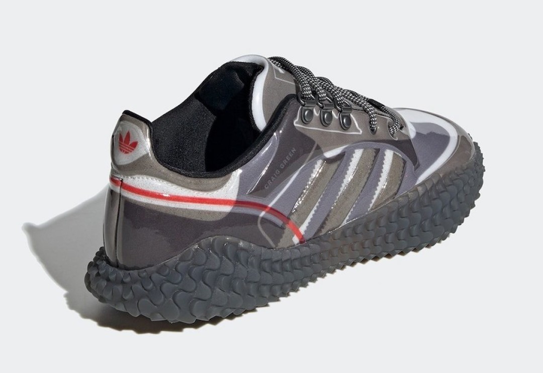 В модели CG Graddfa AKH подошва Kamanda покрывает весь силуэт. Полупрозрачная кожа нанесена на мягкую тканевую основу с тремя фирменными полосками, напоминая кожу рептилии.