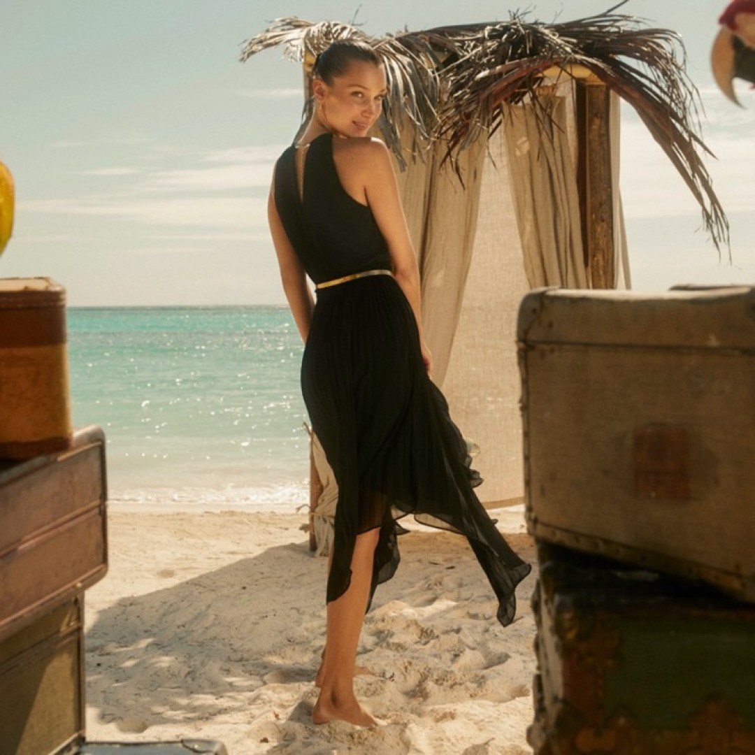 В кадре модель появляется в полосатом топе с джинсами и в черном вечернем платье из легчайшего шифона.