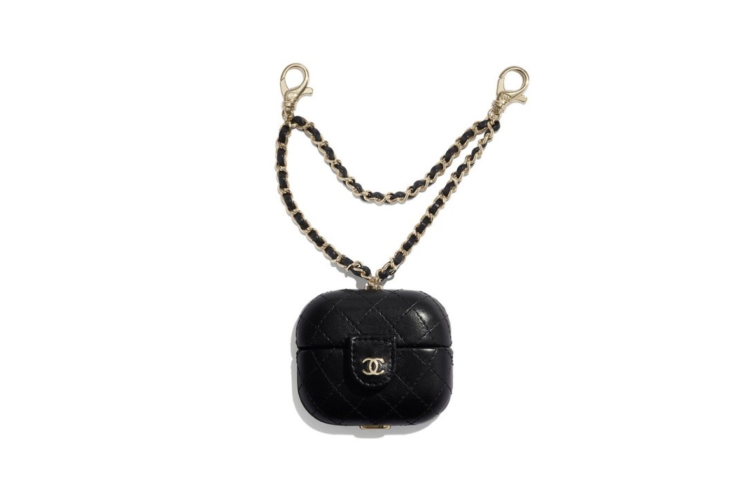 Чехлы для AirPods выполнены в двух вариантах: один — черный стеганый из кожи, другой — розовый из твида. Оба дополнены миниатюрным логотипом французского дома и цепочками с карабинами, за которые их можно прикрепить к сумке или одежде.