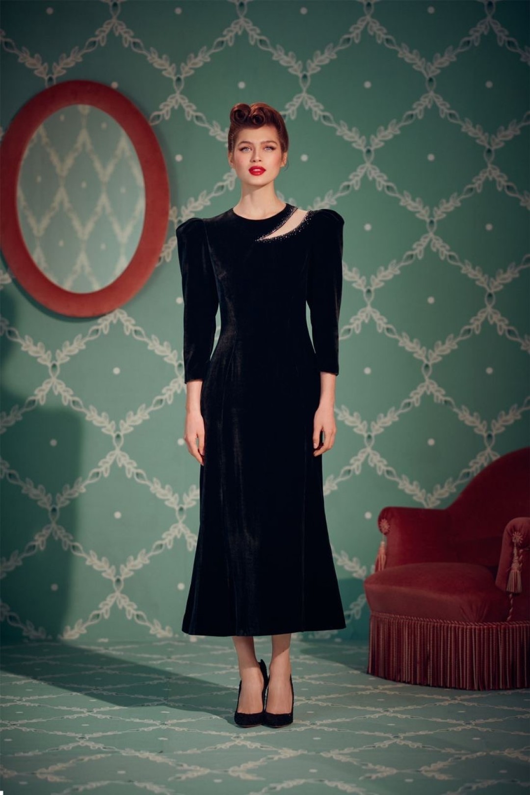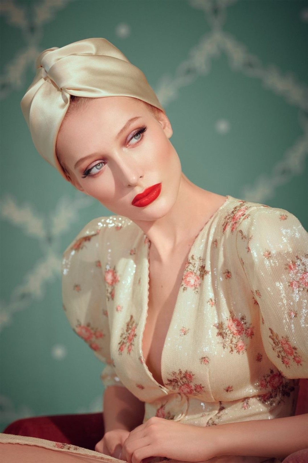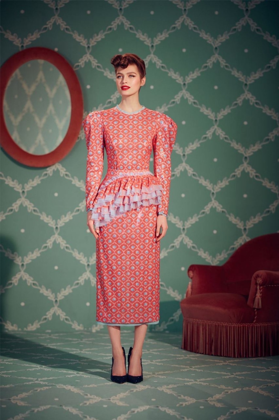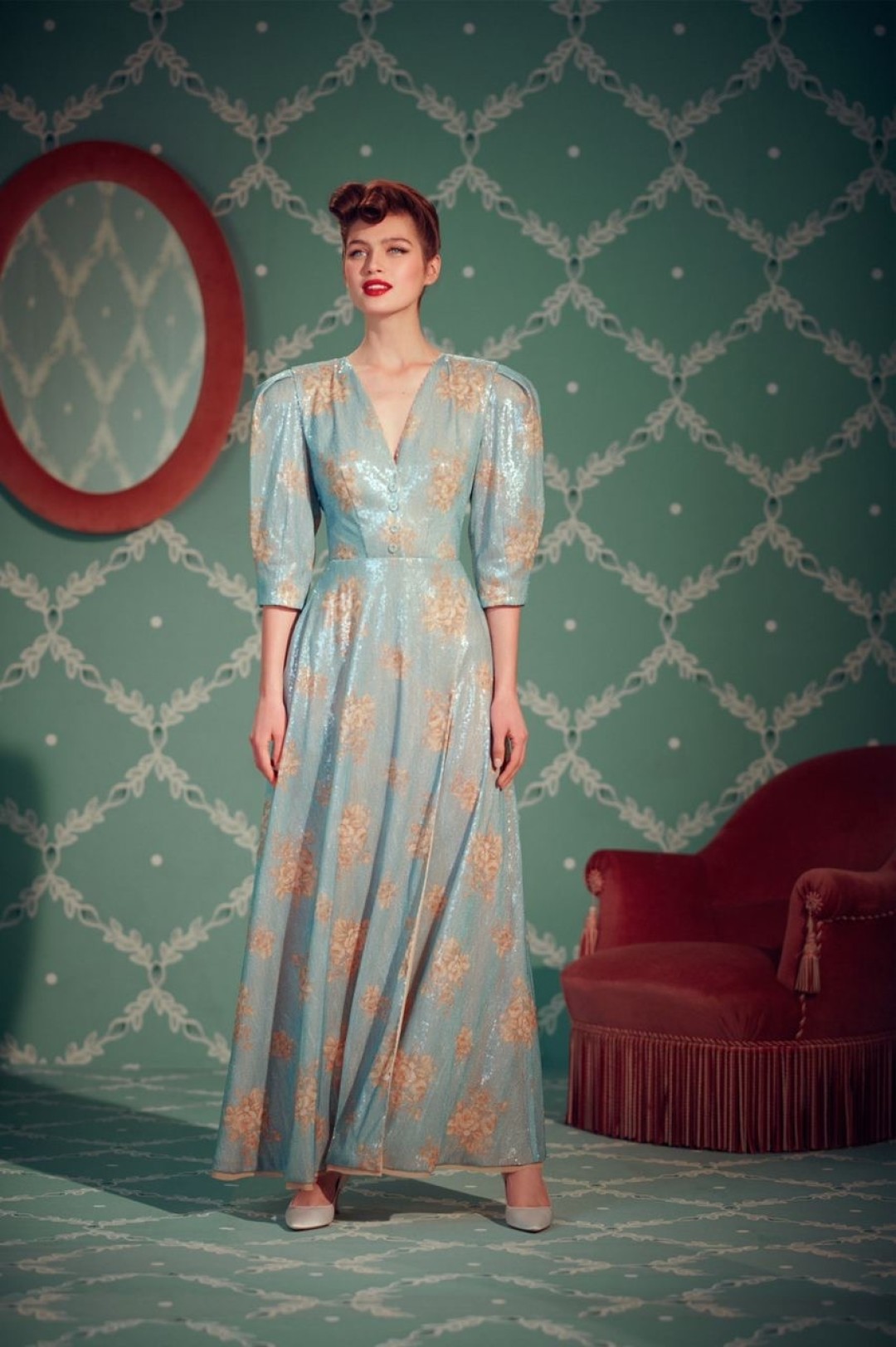 Новая праздничная коллекция Ulyana Sergeenko создана в стиле 40-х: акцент на линии плеч, тюрбаны из шелка, бархатные ткани, а также цветочные принты приглушенных оттенков, расшитые пайетками.