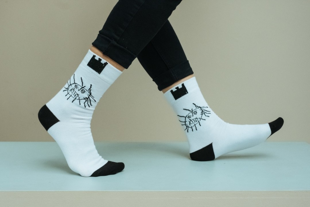 В коллекцию также вошли авоськи и носки, а также переводные татуировки, созданные при помощи Андрея Кичатова. Вещи из коллекции полностью отшиты из хлопкового интерлока.