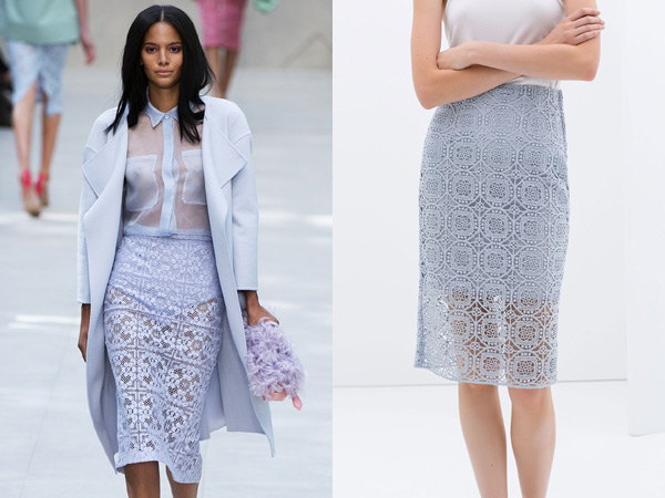 Кружевной костюм с показа Burberry уже доступен и в бюджетных магазинах. И если британская марка выпустила юбки только в двух вариантах — лиловом и белоснежном, то испанский масс-маркет предлагает широкую палитру — от нежно-голубого до черного.