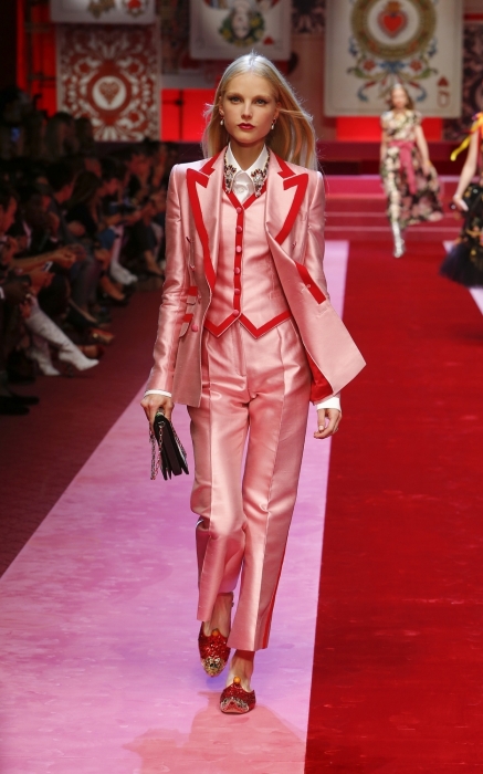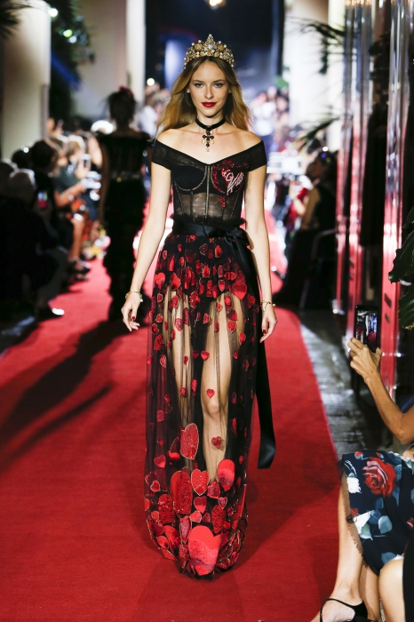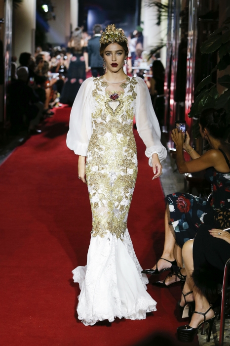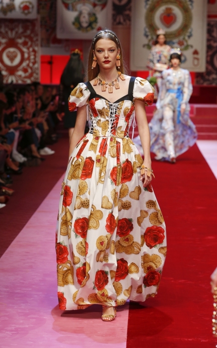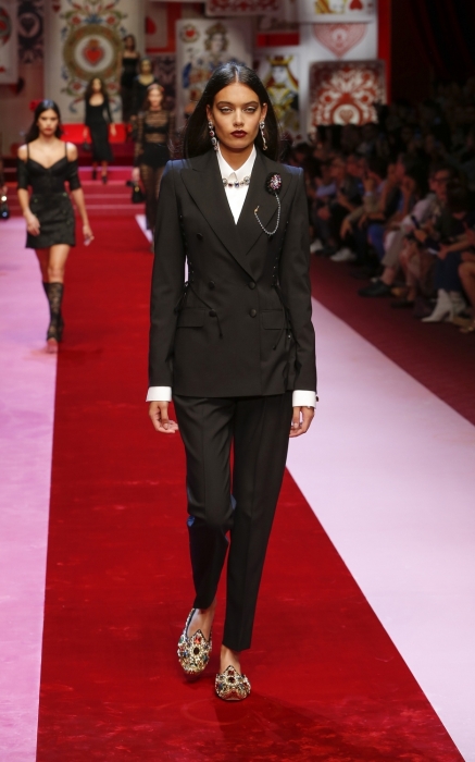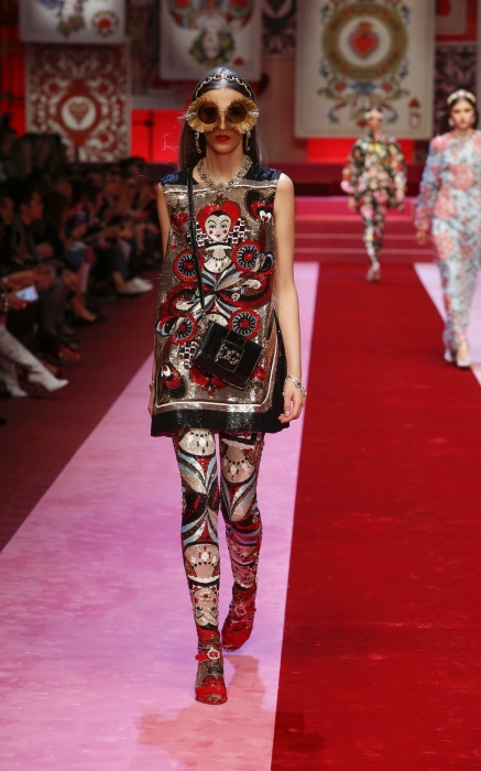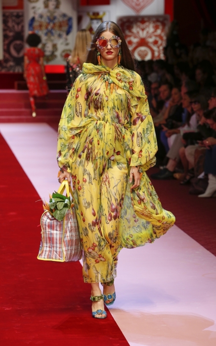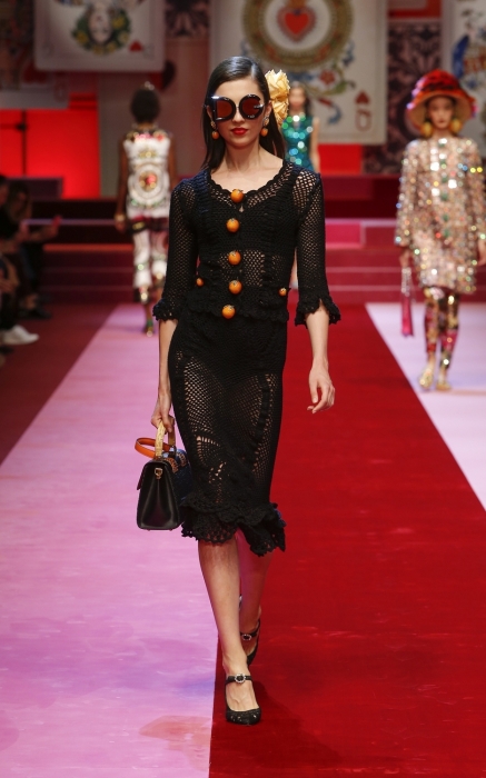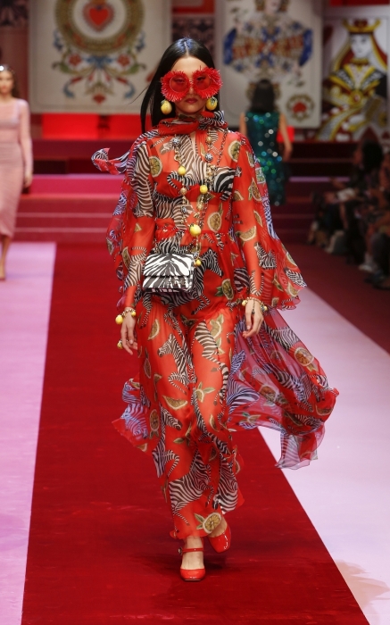 Доменико и Стефано традиционно пытаются охватить обширную аудиторию клиентов — от бабушек, которые систематически появляются в их кампейнах, до девушек с красных дорожек набережной Круазет. Для последних в коллекцию добавили простые платья без принтов, нашивок и культурных референсов — только декольте, блестки и любимое знаменитостями просвечивающееся нижнее белье. Девиз бренда «наши платья подходят всем» посвящен и миллениалам — итальянские дизайнеры быстрее остальных поняли, кто будет составлять основу покупательского сегмента через 10-15 лет. Для них Dolce & Gabbana расписали фломастером кеды, сделали сумку-торшер, замиксовали китайские баулы с платьями ручной вышивки и выпустили очки с пальцами для идеального селфи.