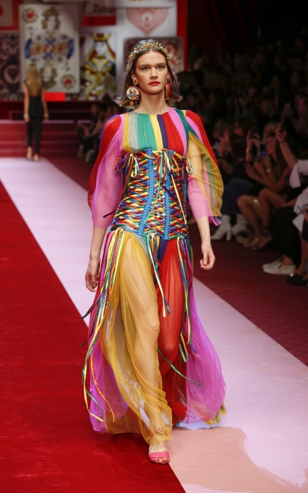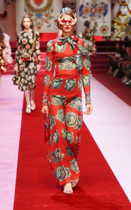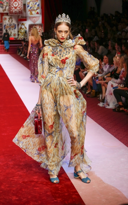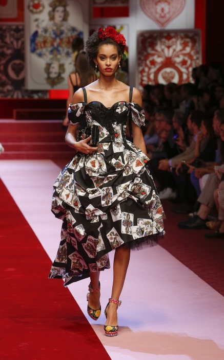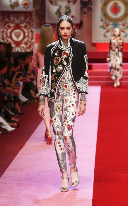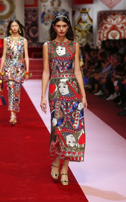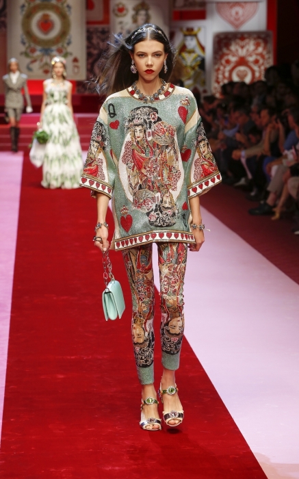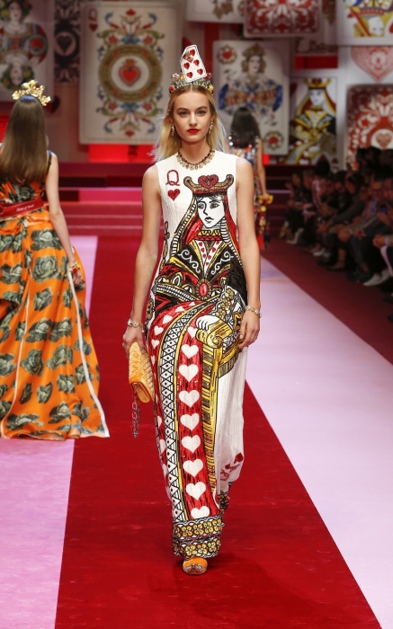 После оммажей католицизму, Сицилии и демографическому буму Dolce & Gabbana решили разложить пасьянс (в прямом смысле слова) и погадать на то, продастся ли их новая весенне-летняя коллекция. Помимо платьев с «карточными» принтами в виде бубновых королей, дам червей и крестовых валетов, в нее вошли плетеные корсеты, розовые костюмы-тройки, очки с бахромой и сарафаны с капустой (нет, мы не шутим).