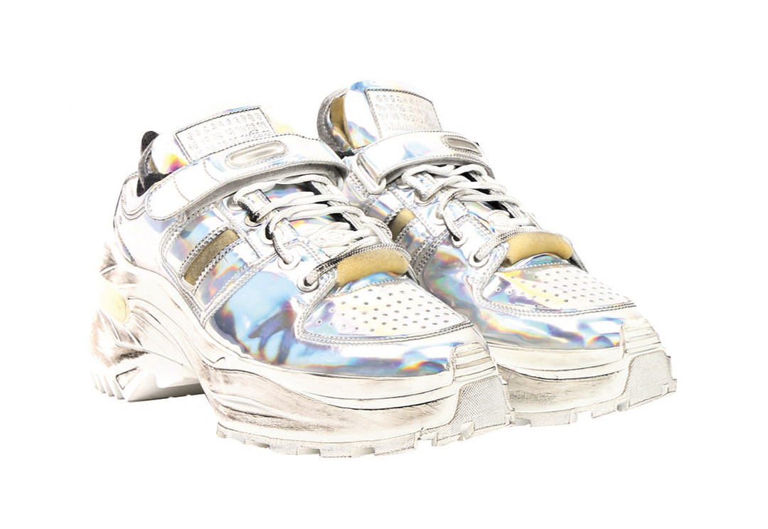 Кроссовки с перламутром от Maison Margiela спасут и в ливень, и в стужу, и от скучного образа. Массивные кроссовки покорили своей комфортностью, непосредственностью и практичностью. Поэтому, без сомнений, выглядеть в платье и данной обуви можно на все сто.