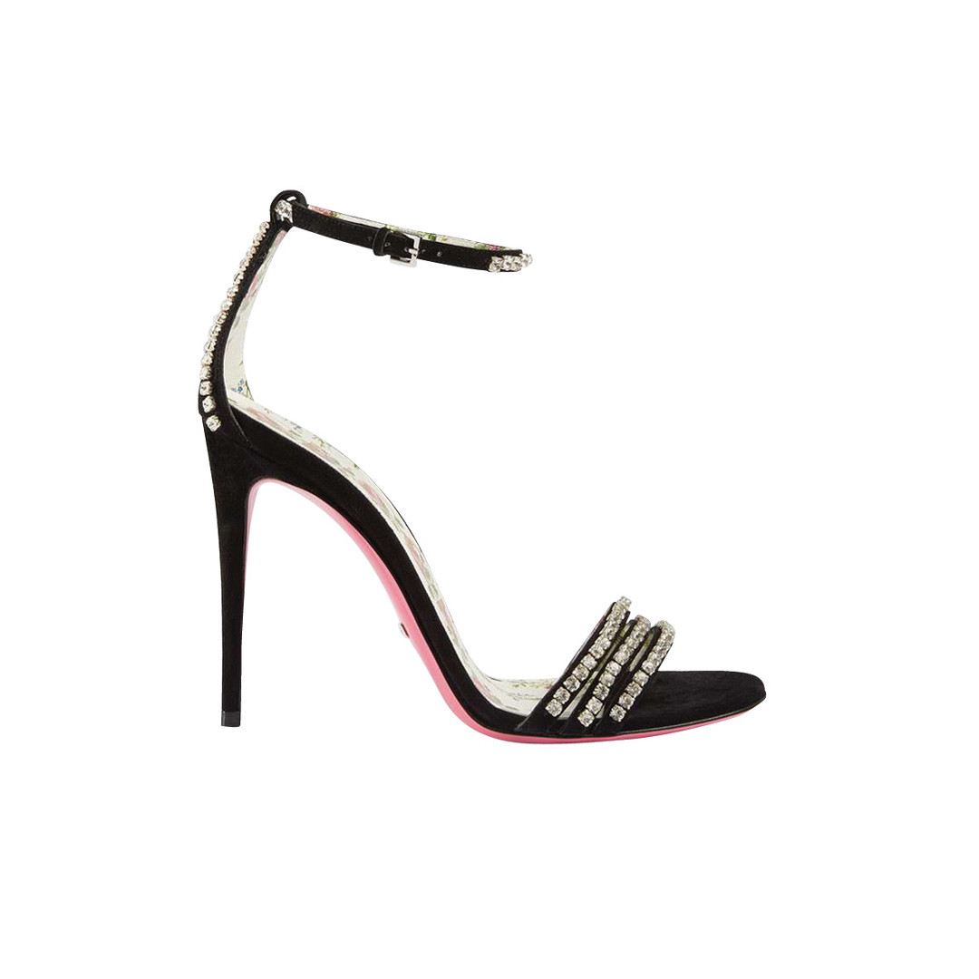 Чтобы жених случайно не перепутал подружку со своей невестой, помогут черные босоножки Gucci с кристаллами, которые как раз прекрасно подойдут под маленькую сумочку.