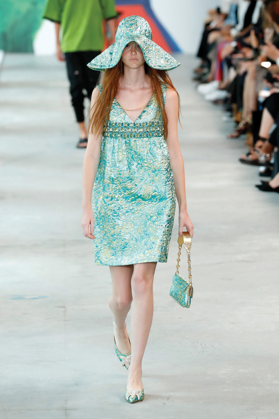 Ура, парча! В MICHAEL KORS COLLECTION из нее сшиты царские брючные костюмы, babydoll-платья, умопомрачительные панамы будто из фильмов с Брижит Бардо и даже сумочки-конверты. Парчовым должно быть все, с обязательной добавкой золотого шитья и сияющих каменьев!