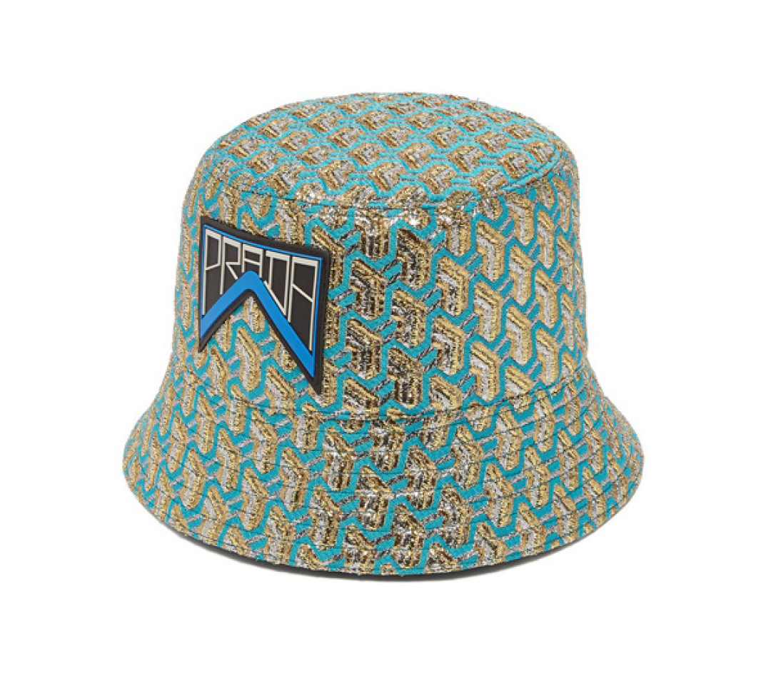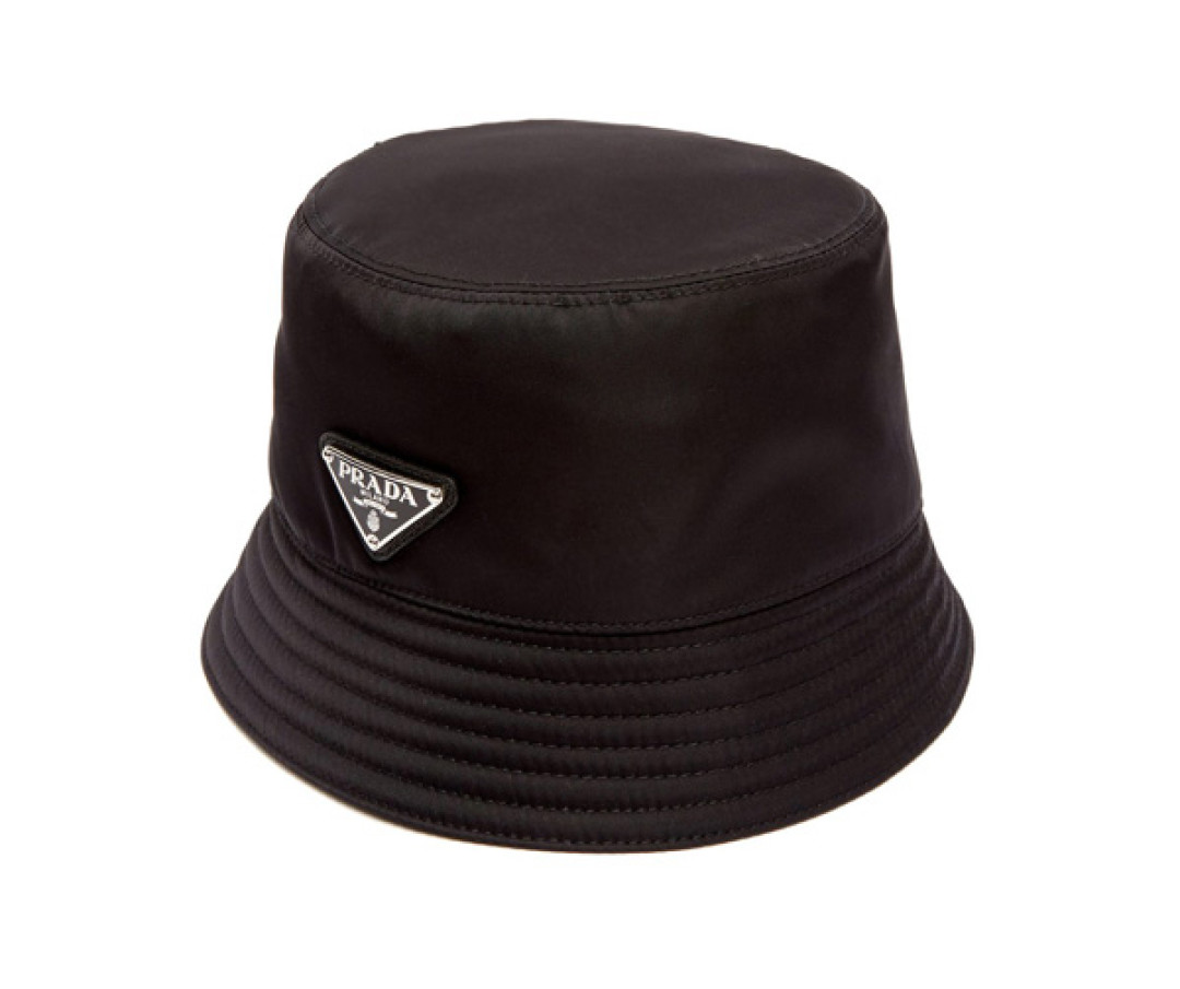 От южных солнечных лучей и взглядов поклонников защищаемся панамой Prada с блестящим шелком на принте и черно-синим каучуковым логотипом с аппликацией фирменного треугольного логотипа дома.