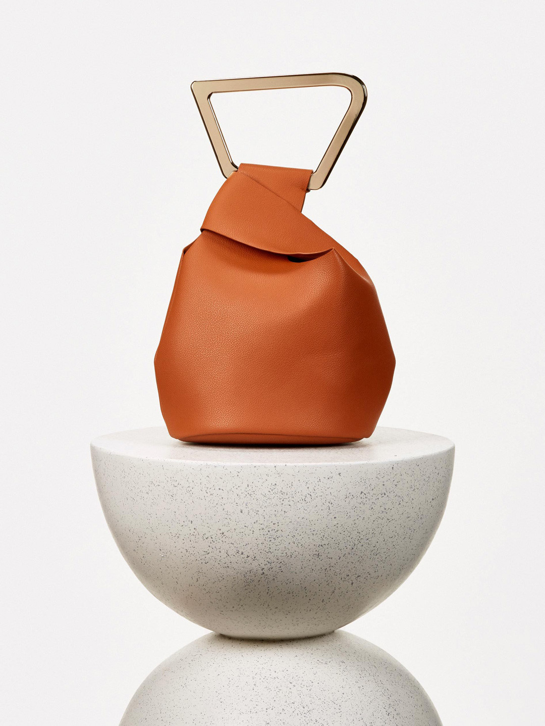 Мы все помним плетеную сумку Ark полукруглой формы из бамбука. Именно после ее появления все заговорили об американском бренде Cult Gaia. Благо, это не единственная вещь, из-за которой брендом восхищается добрая половина модниц мира. На осень берем сумку карамельного цвета из натуральной кожи с необычной геометрической ручкой.
