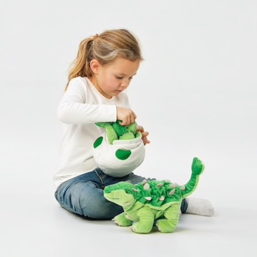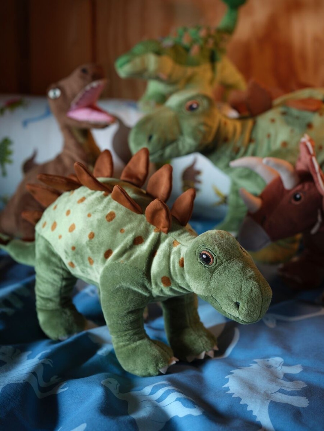В ассортименте мягких игрушек — шесть видов динозавров: трицератопс, велоцираптор, стегозавр, тираннозавр, анкилозавр и бронтозавр.
