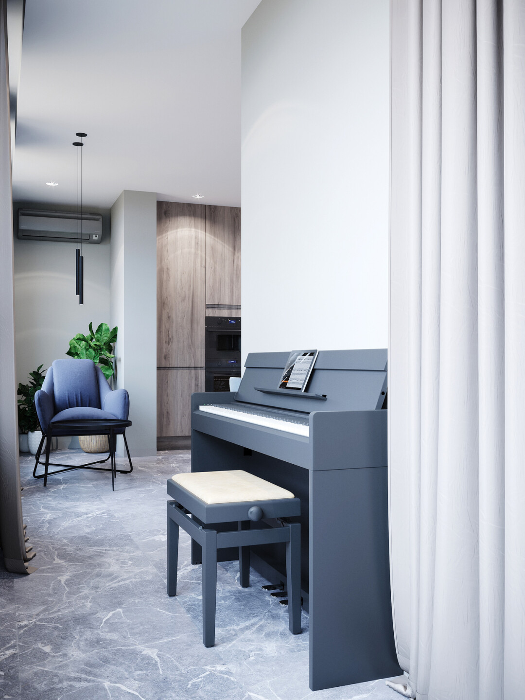 Квартиру команда студии делала для семьи с двумя детьми. Важно было предусмотреть индивидуальные зоны для каждого члена семьи по интересам: укромную зону на лоджии для отца семейства, уголок с фортепиано для мамы и младшего сына, детскую мечты для детей. И, конечно, проработать основные зоны для совместного отдыха — кухню и гостиную, чтобы чаще собираться вместе за столом или во время отдыха за прослушиванием хорошей музыки на пластинках.