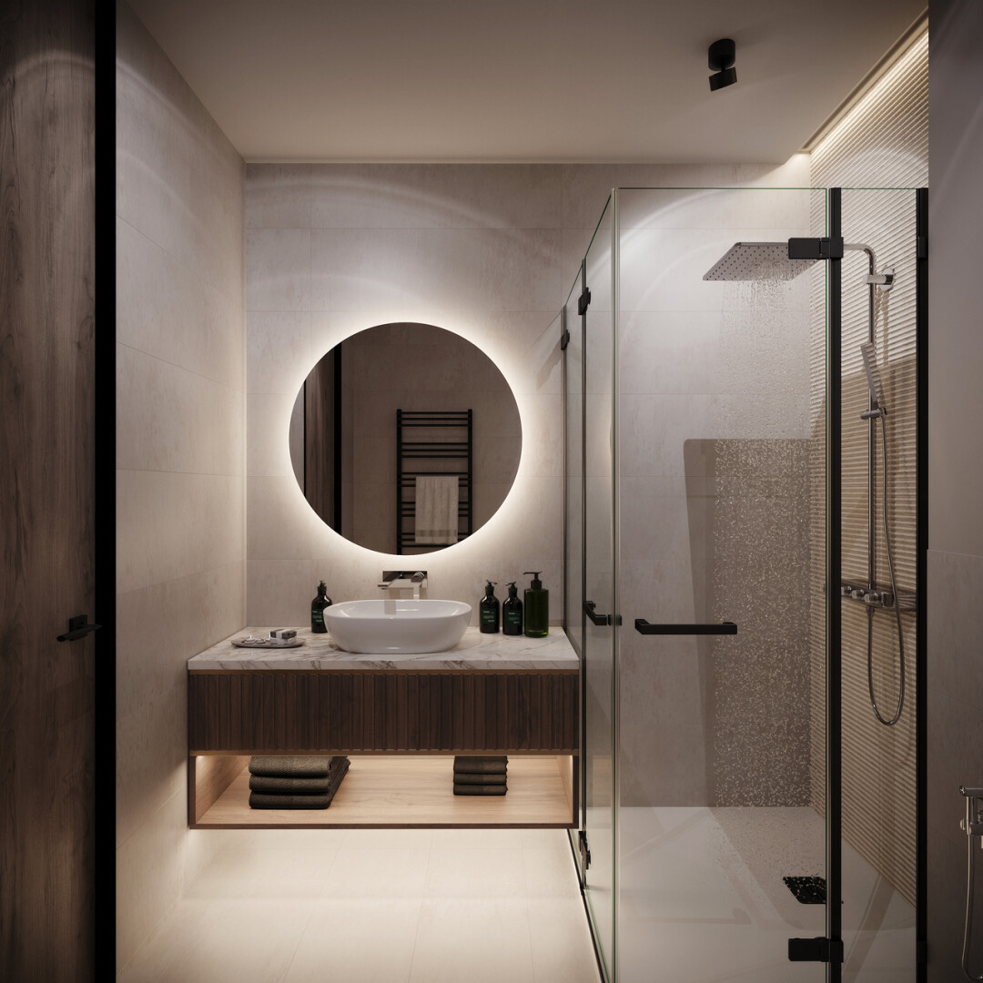 В санузлах команда проекта добивалась нейтрального и одновременно благородного стиля, сочетая натуральные оттенки вулканического песка и дерева. И не упустила возможность сделать функциональные шкафы над инсталляцией. В большом санузле полки для хранения размещены так, чтобы жильцы квартиры могли убрать все лишние элементы с поверхностей.