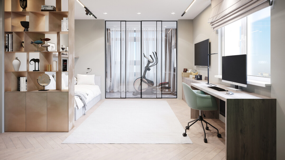 Основной задачей стал визуальный подъем потолка квартиры в ЖК «Тургенев». Его высоты было недостаточно, но эту проблему команде удалось решить с помощью высоких дверей, правильной цветовой гаммы всего объекта и освещения. В прихожей при входе использовали керамогранит, чтобы ограничить «грязную» зону и продлить интерьеру жизнь, а стены выкрасили в глубокий серый Greekside Green бренда Benjamin Moore. Тут же предусмотрели скрытую систему хранения — встроенный шкаф, интегрированный в интерьер без лишних деталей. Такие шкафы предусмотрены практически везде. Получилась функциональная комната с закрытыми поверхностями без лишних деталей. Также в каждом помещении расположили основное и акцентное освещение с обязательной индивидуальной подсветкой важных зон, например, над рабочей зоной кухни и управляемый свет для чтения у спальных мест. Концепция освещения всего проекта — современный технический свет. Отдельное внимание уделили размещению выключателей — они расположены логично и удобно. Есть и переключатели, которые помогают управлять светом из разных точек помещения. Команда скомбинировала разные группы источников света так, чтобы можно было задать разные сценарии освещения. Все пространство объединено общим смыслом и стилем. Поэтому и подбор текстиля во всех помещениях был комплексным, в основном ткани подбирались нейтральные, дополняющие интерьер. Декор минимизирован, так как акцент был сделан на стены и контрасты.