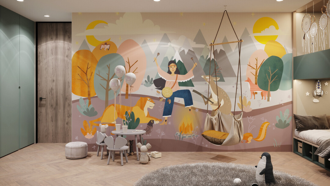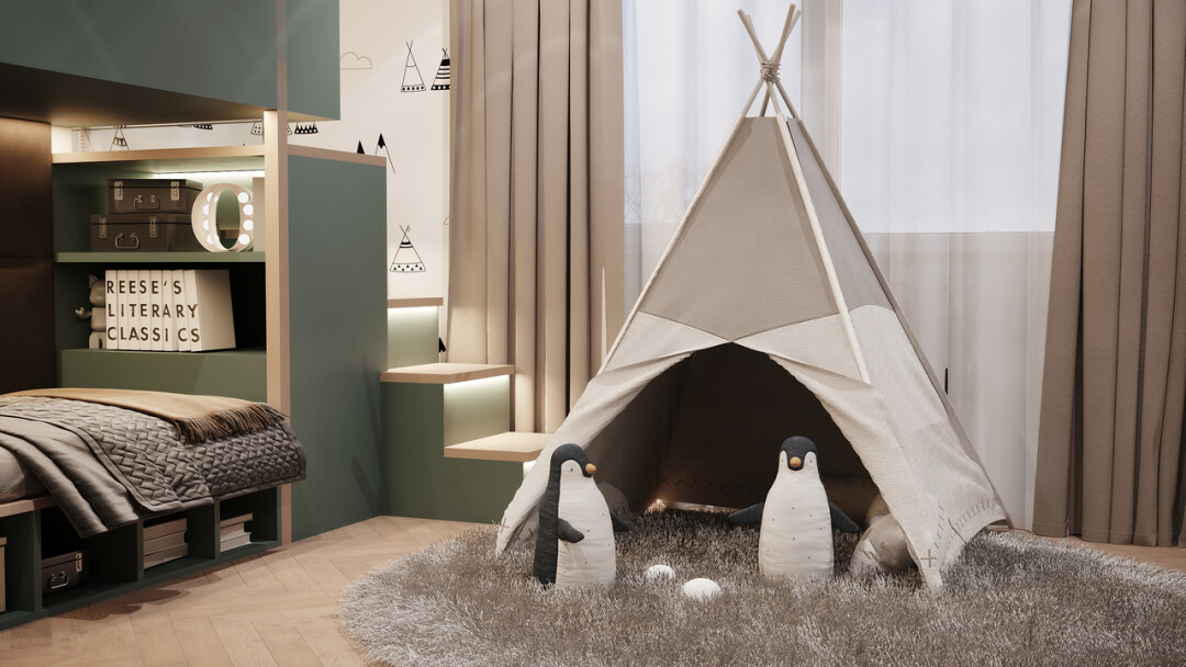 В комнате старшего сына светлые стены сочетаются со шкафами изумрудного цвета и со стеллажом оттенка холодного золота. Это сложное сочетание чаще применяют в классическом стиле. Но команда рискнула повторить прием и в современном исполнении, в результате получилось насыщенно и графично, а с учетом чистых линий еще и легко. Все оттенки в этой комнате природные (например, Natureˆs Essentials Benjamin Moore), ассоциируются с чем-то новым, свежим и молодым. Для хранения тут разместили большой функциональный шкаф, а стеллаж стал отличной перегородкой, отделяющей спальное место от двери. Рабочий стол разместили у окна, чтобы заниматься делами можно было с видом и хорошим освещением. Цветовая гамма детской тоже не нарушила общую концепцию интерьера квартиры. Цвета тут, как и в других комнатах, повторяются, но не скатываются до типичных синих, голубых и тому подобных. При этом команда обратила внимание на универсальность цвета, учитывая возраст ребенка и будущий переход из дошкольного в школьный возраст. Акцент — стена с изображением индейцев, которую предложила сама хозяйка квартиры. На остальных стенах — сочетание цвета травы и разных оттенков охры. Ассоциации — лес, магия, ловец снов. На входе разместили встроенный шкаф, а у противоположной стены поставили кровать-чердак, под кроватью — зона с гостевым диваном на случай ночевок или для отдыха, рядом маленький отдельно стоящий стол, который можно будет заменить на полноценный рабочий со стеллажом, когда малыш подрастет.