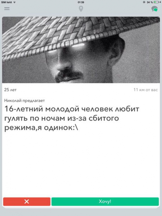 Личный опыт. Репортаж требовал решительности — это было единственное приложение, в котором я уже сидела до редакционного задания, но тогда знакомства не двигались дальше робких приветов. Сейчас же пришлось забыть про мамины заветы и «написать мальчикам первой». В бешеном темпе потратив лайки на первых встречных, я отправила всем, кому понравилась (около 20-ти парней) одно и то же сообщение: «Добрый вечер, не хотите ли однажды прогуляться?». Пройтись прямо сейчас согласились двое — я поставила на модного хипстера с рыжими закрученными усами. И, когда мы буквально через полчаса встретились, я на мгновение пожалела о развиртуализации — это был Tinder-сюрприз: у метро меня вместо стильного усача встречал мужик в дедушкиной одежде. Мы отправились мерзнуть в Лопухинский сад, а по пути он рассказал мне, что на днях вернулся из путешествия: переплыл на яхте с небольшой командой Черное море. Мы обменялись рассказами о шторме, первых съемных квартирах, родителях и родных местах, а когда я аккуратно подошла к вопросу, давно ли он в Tinder и как успехи, он поделился, что всего пару раз удавалось к кем-либо встретиться и то одноразово, и что азарт теряется от такого многообразия. Мои распросы навели спутника на подозрения: «Я понял! Так ты со мной для статьи встречалась?». Впрочем, кто-то об этом догадывался моментально. Один из «лайкнутых» сразу же задал мне этот вопрос, и когда я «кокетливо» заявила: «Ага, страшно теперь?», Дмитрий написал: «Пффф, у меня куча фактуры и историй, давай-ка встретимся» — смельчак оказался работником серьезного экономического издания (нашла, кого пугать).