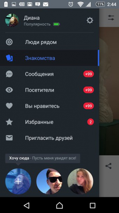 Как работает приложение. Основная отличительная особенность сервиса в том, что это мировая социальная сеть, у которой есть отдельная мобильная версия. По факту, приложение — это Tinder с русским духом: предлагается авторизироваться через «Вконтакте» или Facebook, выставить фотографии и написать о себе, а затем «лайкать» или ставить красный крестик. Можно посмотреть, кто с вами находится совсем рядом, увидеть, кто заходил к вам на страницу, и проверить, кому вы нравитесь в двух блоках: «новые симпатии» и «взаимные симпатии». Приложение не даст вам забыть о том, что вы в активном поиске любви: на каждый «лайк» вам придет оповещение «вами заинтересовались мужчины» или «вы нравитесь новому мужчине», а если вам напишут — на экране смартфона появится надпись «новое сообщение от Ибрагим». Приготовьтесь к тому, что ваш телефон будет буквально разрываться от уведомлений, как будто вы солидный бизнесмен.