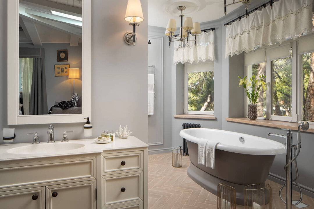 В-третьих, территория разделена на несколько зон. Тут есть спа-отель с сорока двумя номерами (что предпочитаете: вид на море или парк?), каждый этаж там посвящен отдельной стихии. Мебель в виде облаков, бело-голубые интерьеры — это «Воздух», камин, тематические картины с пламенем, оттенки охры, золотая поталь — это «Огонь». Честно говоря, хочется пожить в каждом из них. А еще тут есть четыре роскошные виллы: «Лазурная» вдохновлена Францией, «Золотая» оформлена в стиле эклектики второй половины XIX века, «Зеленая» — с видом на цветущий сад, «Лиловая» — для тех, кто любит элегантность, оттенки сирени и фиалки.