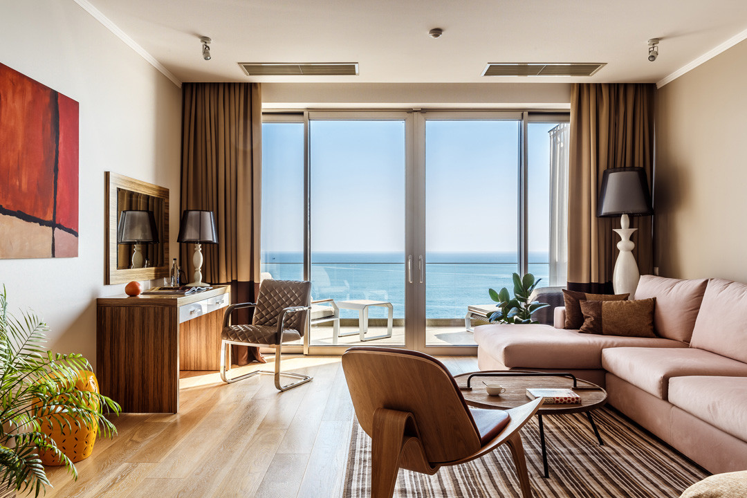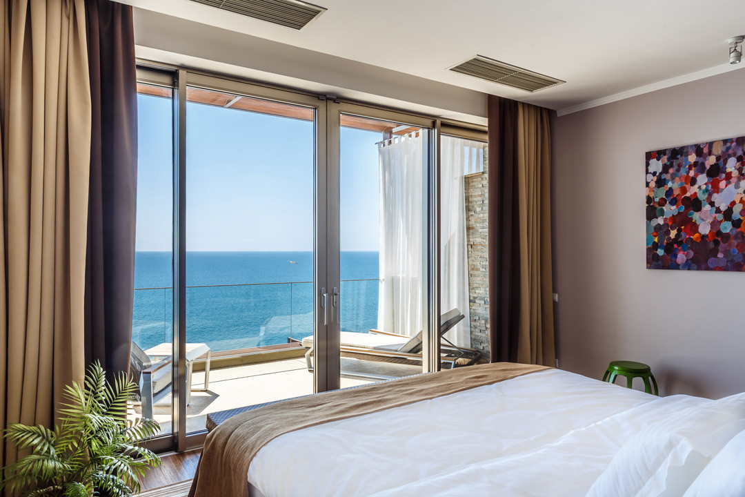 В отеле двадцать восемь номеров — три вида: Junior Suite с балконом, террасой и Junior Suite ≪дизайн≫ с отдельной зоной отдыха. А также большие апартаменты (204 кв. м) с двумя спальнями, четырь я санузлами и джакузи на террасе для компании. Во всех номерах панорамные окна с видом на Черное море.