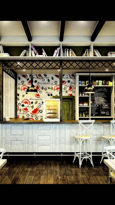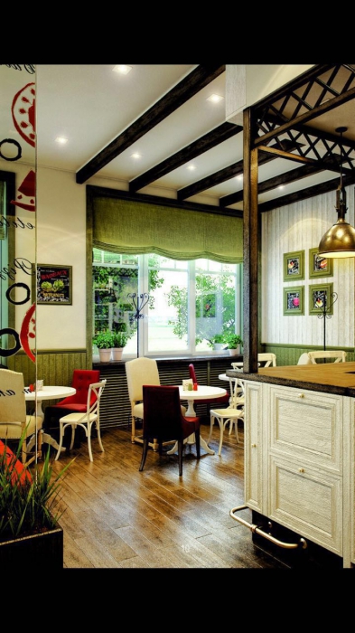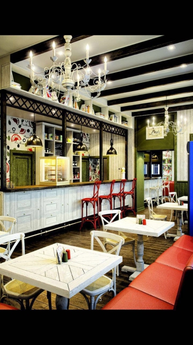 Изменения затронули не только кухню заведения. Начать новую жизнь ресторана решили с обновления интерьера. Получился прованс с элементами эклектики. Оливковые панели, светлые стены, отделанные деревом, в тон им барная стойка, винтажные светильники, цветы. В качестве ярких акцентов дизайнеры-архитекторы Яна Проценко и Майя Матушкина использовали красные кресла, диваны и картины с овощами.