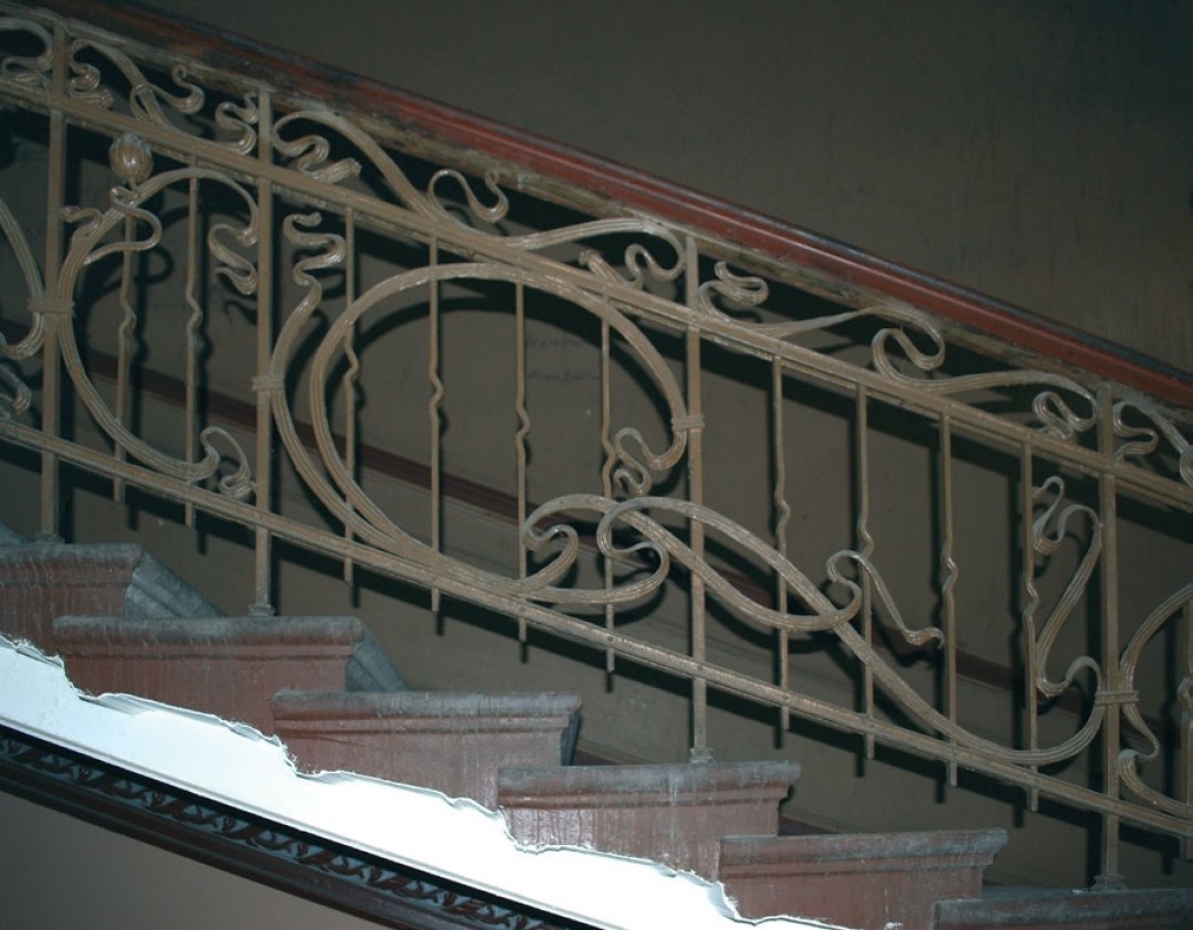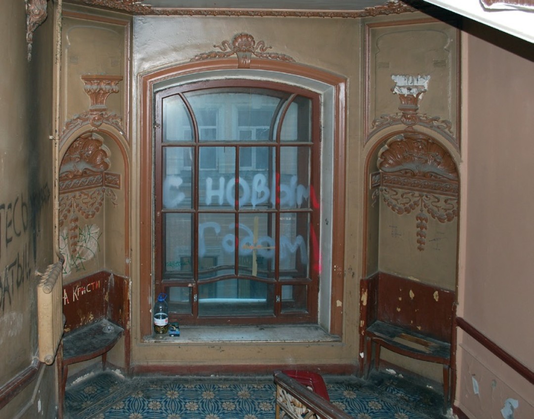 Кстати, в районе третьего этажа уцелела старинная скамейка. Хотя не знаю, в каком состоянии она сейчас — артефакты исчезают как динозавры. Кое-где можно увидеть «родные» квартирные двери — все, как обычно, одного и того же рисунка: что-то восстановлено, что-то воссоздано, что-то никогда не реставрировалось. Например, на четвертом этаже жива коммуналка — там точно уцелела аутентичная, хотя и изрядно потрепанная дверь. Кстати об «авторских подписях» Хренова — это так называемые десюдепорты. Проще говоря, навершия дверей. Они есть (были) во всех хреновских парадных, всегда лепные, но всегда имитирующие дерево.